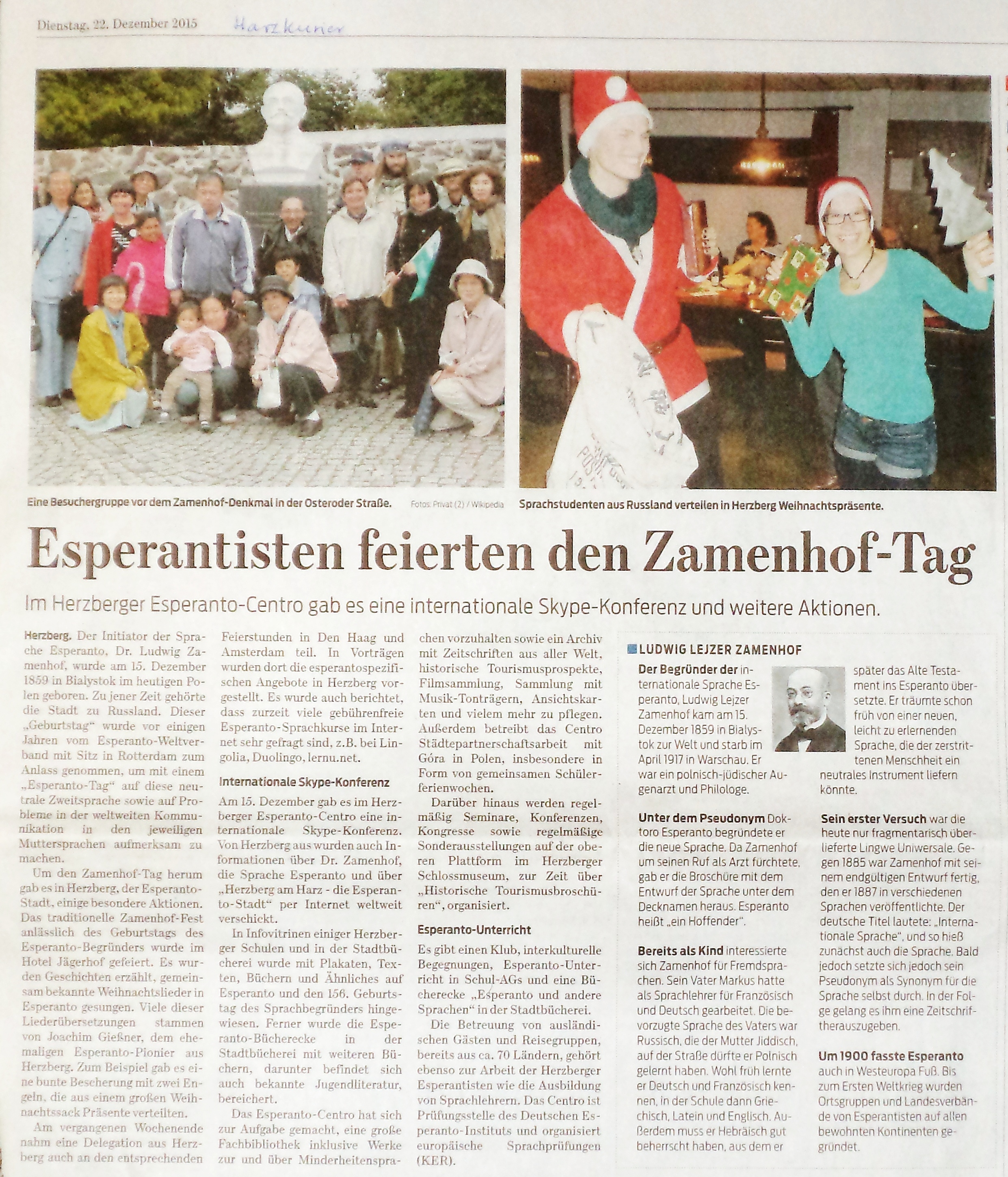 Um den Zamenhof-Tag herum gab es in Herzberg einige besondere Aktionen, z.B. in der Stadtbücherei, Ausstellungen im Schlossmuseum und in Infovitrinen einiger Herzberger Schulen, eine internationale Skype-Konferenz im Esperanto-Centro, usw.