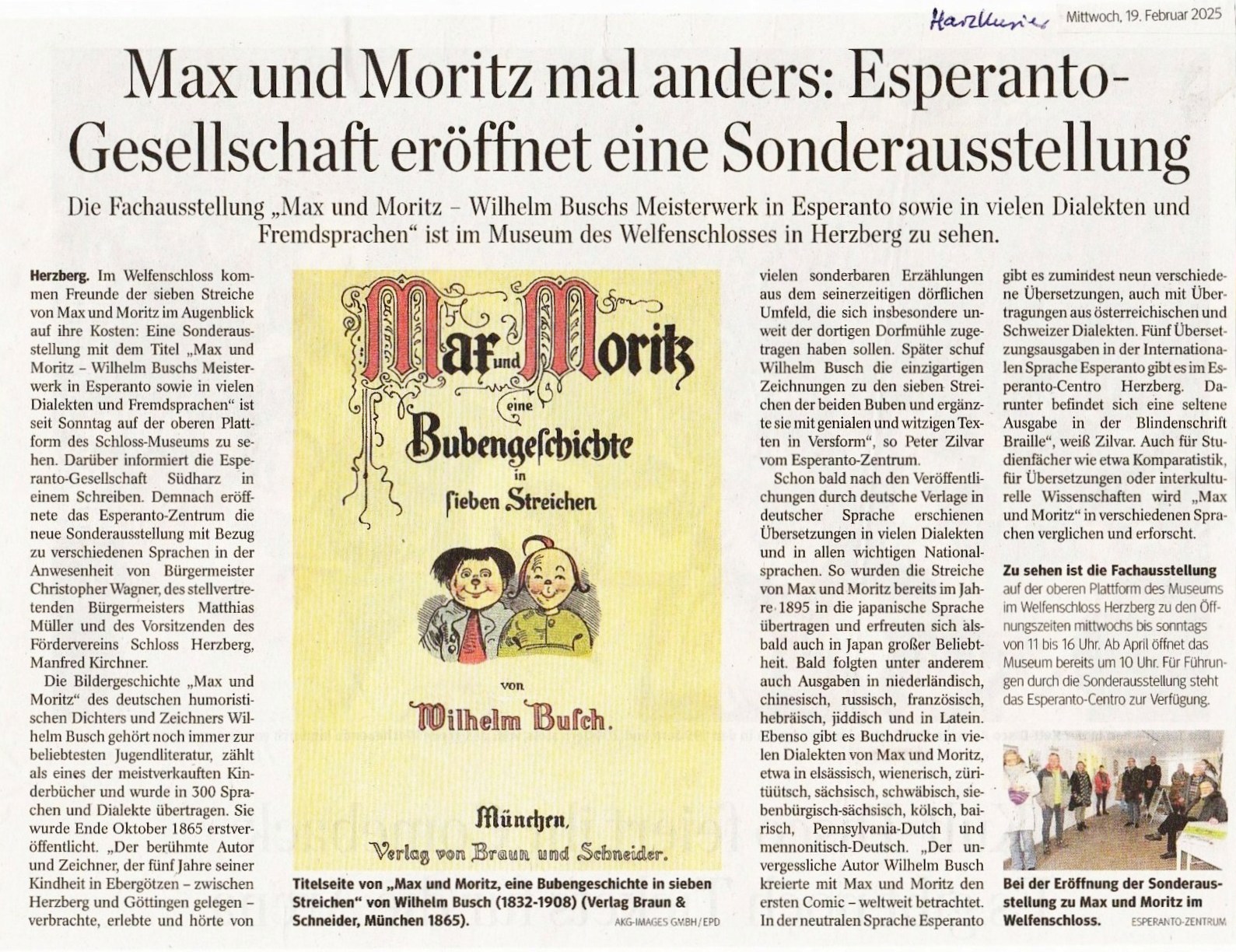La inaŭguron de la nova Esperanto-ekspozicio partoprenis urbestro Christopher Wagner, vicurbestro Matthias Müller kaj ankaŭ Manfred Kirchner, la prezidanto de la Kastela Subtenasocio. En sia malferma parolo Peter Zilvar, la gvidanto de Esperanto-Centro Herzberg emfazis la ligitecon de la fama aŭtoro al la regiono: li vivis en Ebergötzen, proksime al Herzberg kaj lernis pri la agadoj de la du buboj tie. La ekspozicio prezentas iomete la lokon, la biografion de Busch, la verkon en pluraj eldonoj en diversaj lingvoj kaj dialektoj, kaj kompreneble ankaŭ Esperanto-tradukojn. Estas ekspoziciata ankaŭ unikaĵo: Esperanto-versio en Brajl-skribo por blinduloj. La ekspozicio estas vizitebla en la oficialaj malfermhoroj de la muzeo ĝis novembro 2025. La artikolon akompanas granda bildo pri kovrilpaĝo de germanlingva eldono el 1865 kaj grupfoto de la partoprenantoj en la inaŭguro.