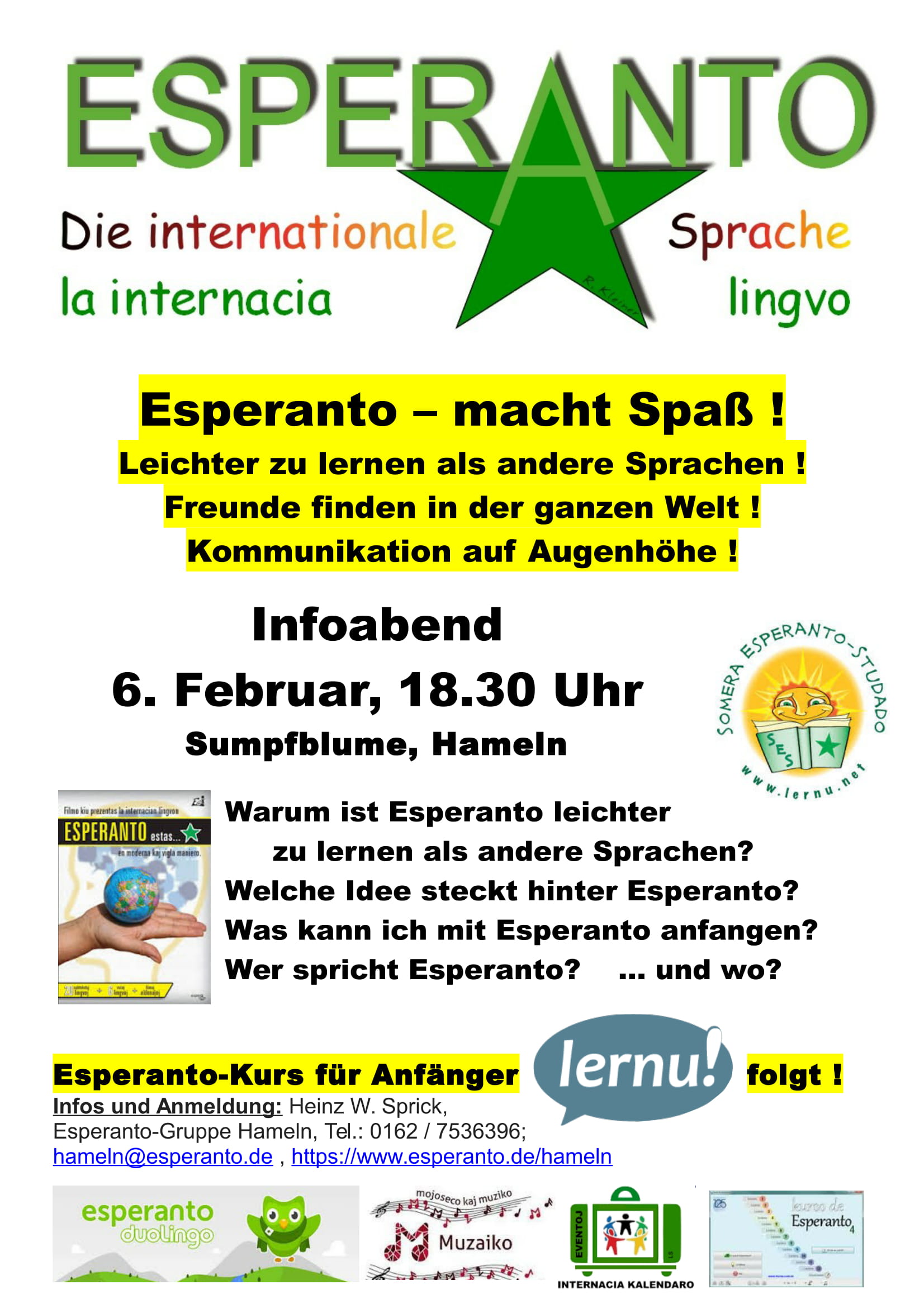 Nova Esperanto-lingvokurso por komencantoj komenciĝas merkredon, la 13-an de marto je la 18.15 horo. Ĝi daŭras dum grupvesperoj ĝis la 19.30 h, en aliaj vesperoj ĝis la 20-a h. Kostoj: 20 € por libro kaj kopioj, daŭro ĉirkau 25-30 vesperoj. Aliĝo kaj pliaj informoj ĉe Heinz W.  Sprick, hamelnatesperanto.de
