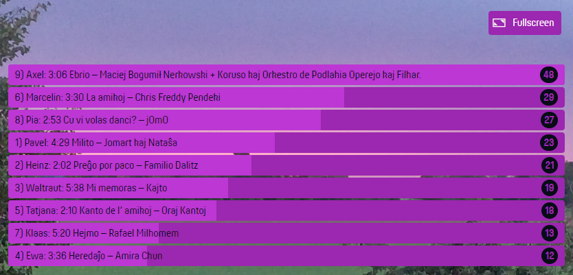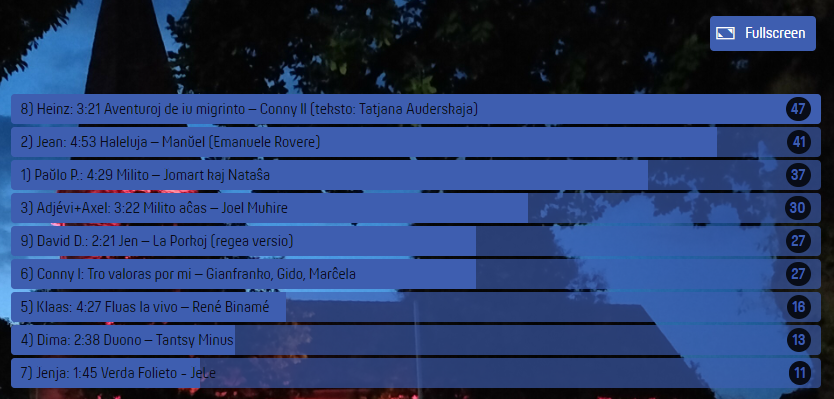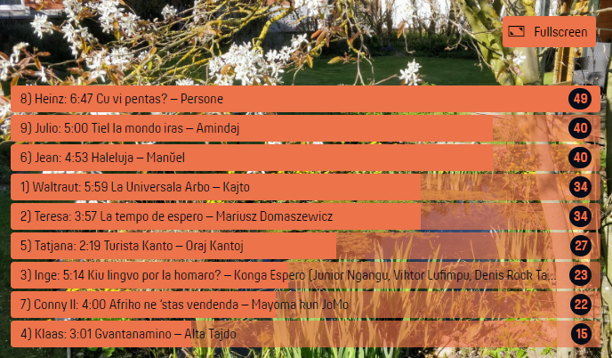 Por vidi la rezulton de la voĉdonado, la ligilojn al la kantoj kaj la resuman filmon, bonvolu viziti la paĝon de Eventa Servohttps://eventaservo.org/e/RB-14dec22-27a_Kantoparado